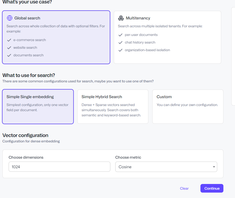 Qdrant是一个专注于向量存储的数据库,觅思文档的内置AI知识库支持配置文档向量数据存储到Qdrant。 ## 使用Docker Compose 部署 Qdrant ``` version: "3.8" services: qdrant: image: qdrant/qdrant:latest container_name: qdrant restart: unless-stopped ports: - "6333:6333" # HTTP API - "6334:6334" # gRPC(可选) volumes: - ./qdrant_data:/qdrant/storage environment: QDRANT__SERVICE__API_KEY: "your-secret-api-key" # 可选:限制只监听本机(更安全) # ports: # - "127.0.0.1:6333:6333" ``` ## 访问Qdrant管理后台 Qdrant 自带一个轻量级 Web 界面,访问: ``` http://localhost:6333/dashboard ``` 如果设置了api_key,输入api key即可进入管理界面。 ## 新建Collection 进入管理界面后,新建一个Collection:   输入collection名称后,选择向量模式,需要注意的是,向量维度必须与embedding模型的维度保持一致。